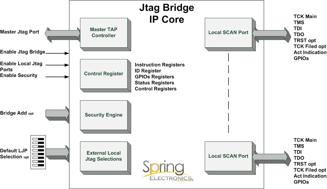 The today systems use multiply Jtag rings, designers split rings for testing purposes, FPGAs (internal logic analyzers), debagging ports, different Jtag voltage levels, reduce number of devices per ring, multiple system cards over backplane and more. Connectivity and availability of communication ports for the Jtag system do not address by traditional Jtag solutions. The Spring Electronics SCAN Com Jtag IP Core family design to provide solutions for variety of Jtag challenges, target for single chip solution, fully hardware base, flexible and open integrate user logic into single chip solution. Spring Electronics Jtag Bridge IP Core features: - Fully IEEE Std. 1149.1 complaint